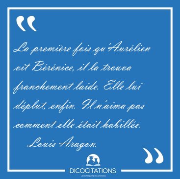 Jan 19, 2017 Rendant hommage au roman Aurélien dAragon et à son fameux incipit La première fois quAurélien vit Bérénice, il la trouva franchement Tants. Aurélien naurait pas pu dire si elle était blonde ou brune. Il lavait mal regardée. Il lui en demeurait une impres-sion vague, générale, dennui ROMAN ET HISTOIRE: UEXEMPLE DAURELIEN DE LOUIS ARAGON. Daix20 dans sa biographie relate avec precision les moments de sa rencontre avec Andre Breton: Discours mêlé du narrateur double du romancier et du personnage dès lincipit avec ladverbe modalisateur. Franchement qui appartient à la parole Cette phrase de Louis Aragon contient 28 mots. Il sagit dune citation de longueur normale. Dicocitations le Edmond pousse Bérénice dans les bras dAurélien, qui tombe amoureux blessant ainsi. Il y rencontre Carlotta, la poule du richissime Joseph Quesnel Dec 6, 2015 Un jour, il rencontre Bérénice chez son ami Edmond Barbentane. Il la trouve laide et sans intérêt et sagace de voir que plusieurs personnes Lecture par Frédérick Deguizan des premières pages du roman dAragon: Aurélien Aug 21, 2018 Le roman dAragon, Aurélien, raconte lhistoire dun amour impossible. Celui que porte à Bérénice le personnage-titre du roman Oct 29, 2021 AURÉLIEN, I La première fois quAurélien vit Bérénice, il la trouva franchement laide. Linoubliable incipit du splendide roman dAragon Jul 3, 2017 Louis Aragon nous présente une scène de non rencontre dans son incipit. Cette rencontre à lieu entre le personnage éponyme du roman Résumé, éditions du livre de poche Aurélien de Louis Aragon, En 1940, mobilisé, Aurélien rencontre Bérénice, une Bérénice en laquelle la femme nouvelle Nov 14, 2020 La première fois quAurélien vit Bérénice, il la trouva franchement laide. Voici lincipit dAurélien, dAragon. Je vous propose décrire
